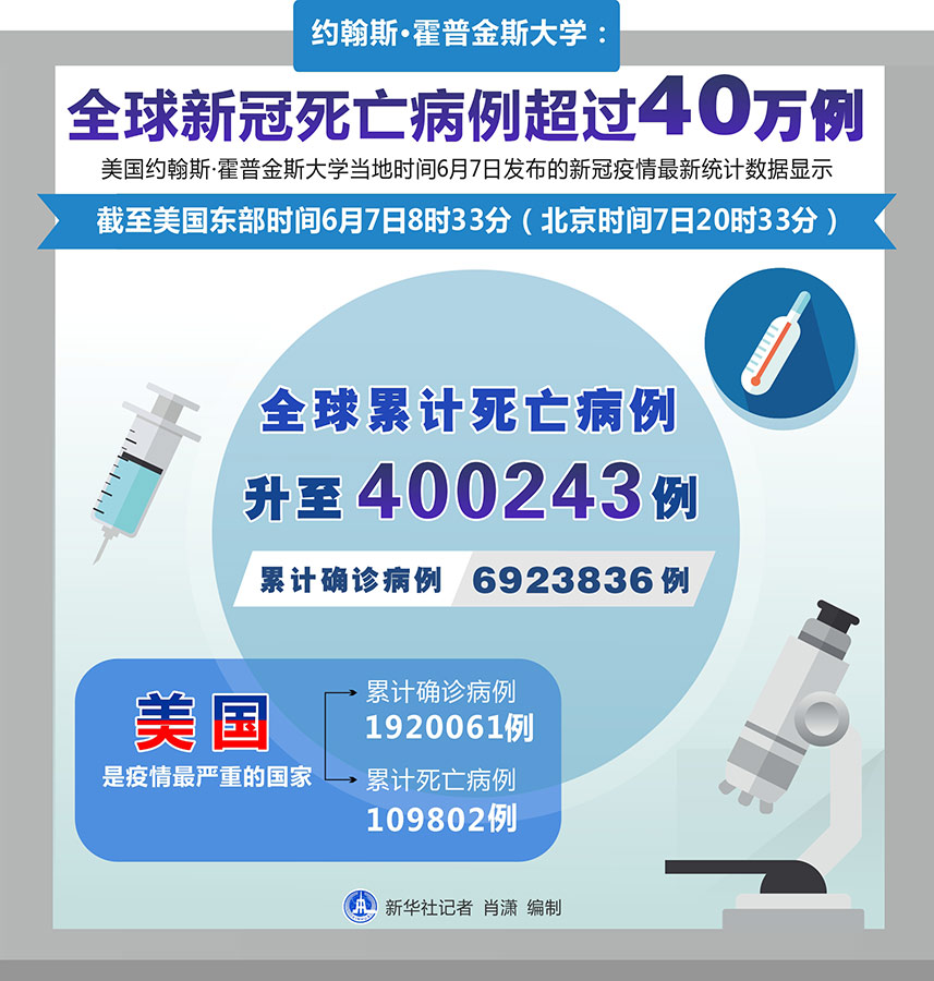 新華社紐約6月7日電 美國約翰斯·霍普金斯大學(xué)7日發(fā)布的新冠疫情最新統(tǒng)計(jì)數(shù)據(jù)顯示,全球累計(jì)死亡病例超過40萬例。