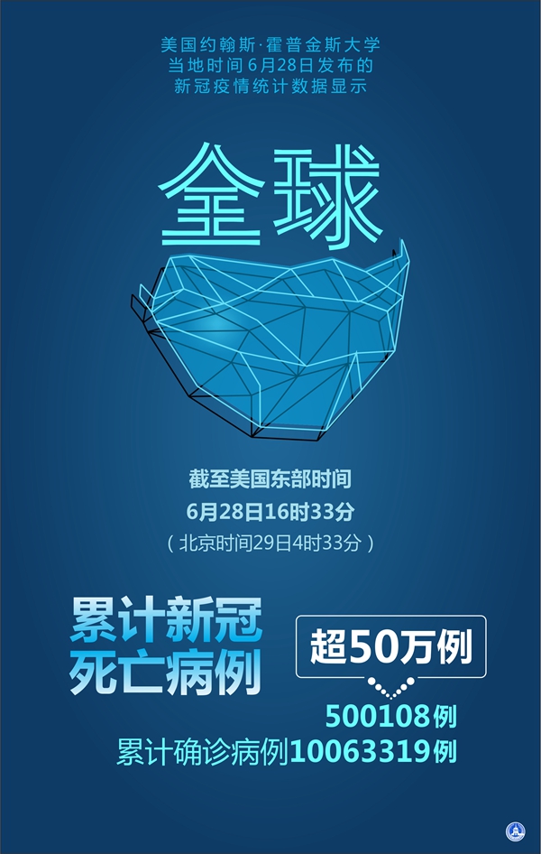 新華社北京6月29日電? 28日全球疫情簡報:美機構統計全球累計新冠病例超1000萬 死亡超50萬