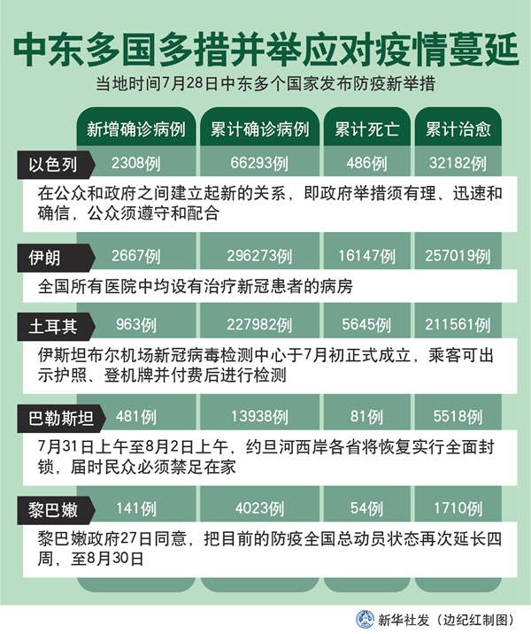新華社突尼斯7月29日電 綜合新華社駐中東地區(qū)記者報(bào)道:為進(jìn)一步應(yīng)對(duì)中東多國持續(xù)蔓延的新冠疫情,同時(shí)防止因宰牲節(jié)人群聚集加劇疫情擴(kuò)散,中東多個(gè)國家28日發(fā)布防疫新舉措。