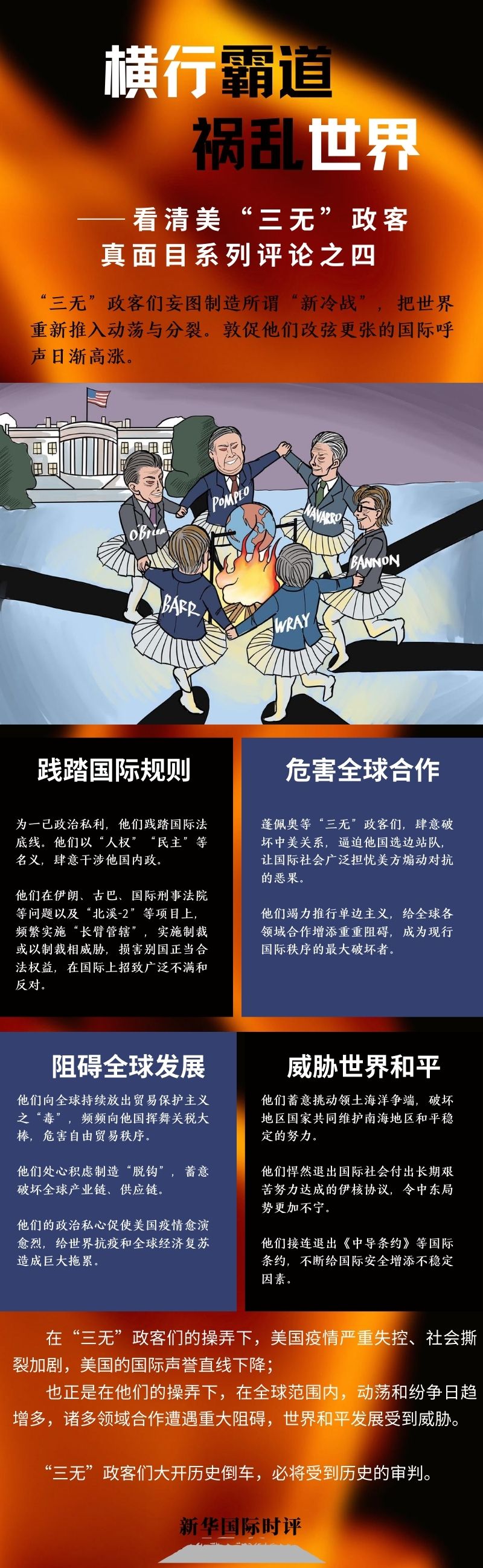 “三無”政客們的亂言與惡行,正在美國和國際上造成種種惡果。正是在他們的操弄下,美國疫情嚴(yán)重失控、社會(huì)撕裂加劇,美國的國際聲譽(yù)直線下降;也正是在他們的操弄下,在全球范圍內(nèi),動(dòng)蕩和紛爭日趨增多,諸多領(lǐng)域合作遭遇重大阻礙,世界和平發(fā)展受到威脅。“三無”政客們大開歷史倒車,必將受到歷史的審判。