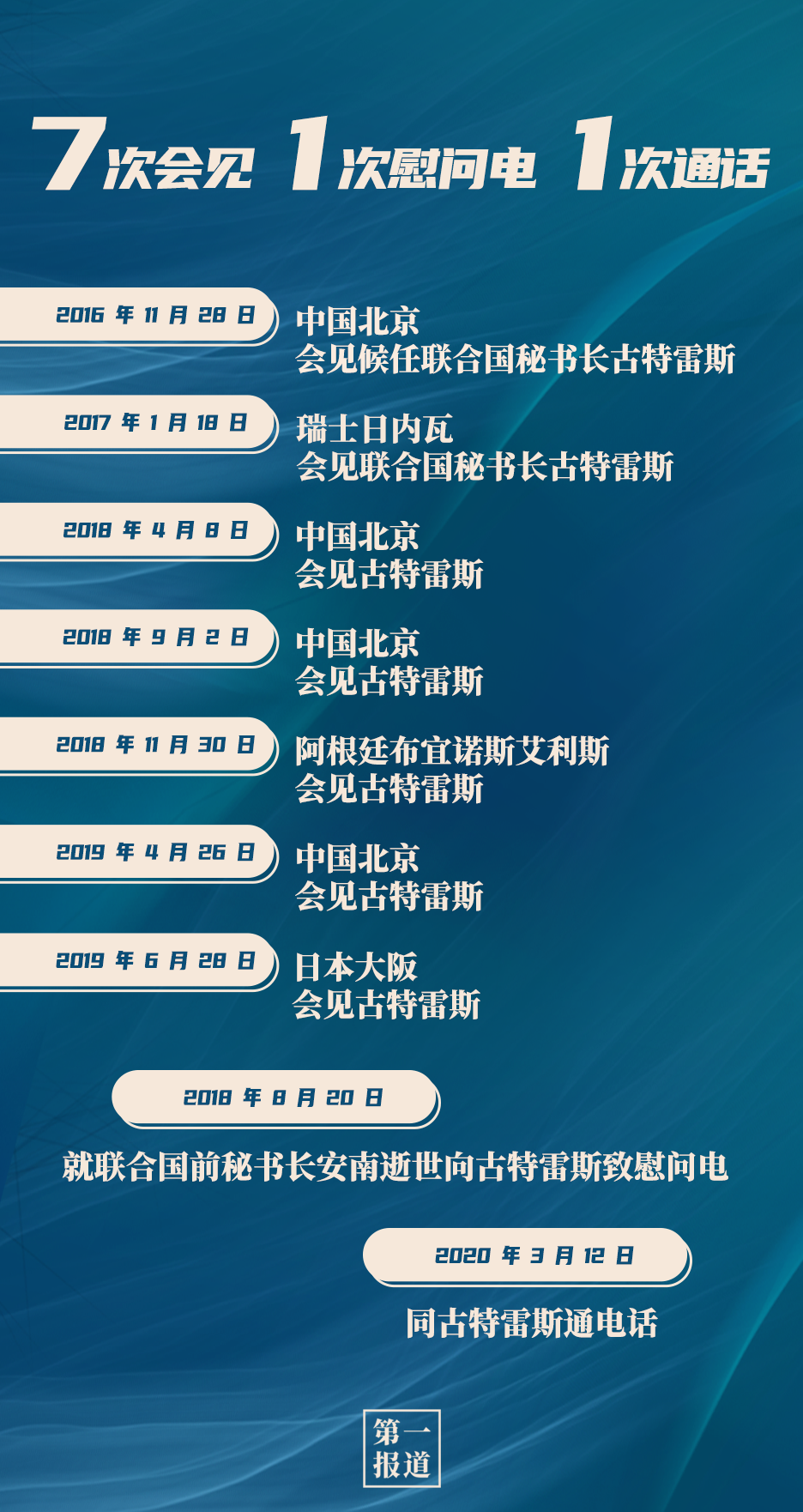 其中,習主席同聯合國“掌門人”的交往互動最為頻繁,截至目前,習主席已7次會見聯合國秘書長古特雷斯。今年,在全球暴發新冠疫情的特殊情況下,習主席還通過“電話外交”同古特雷斯保持溝通交流:
