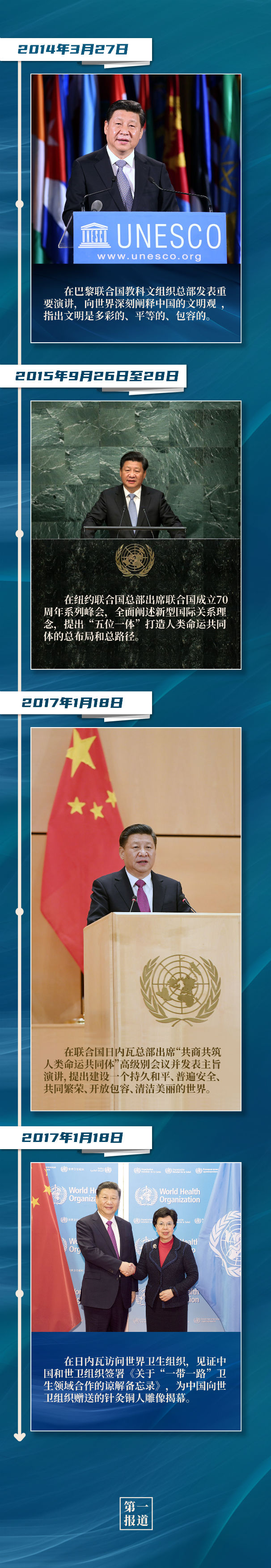 紐約聯合國總部、聯合國日內瓦總部、聯合國教科文組織總部、世界衛生組織,這些地方都留下了習主席的訪問足跡。站在聯合國講臺,習主席闡述關于促進世界和平發展的重要主張,表達對聯合國事業的堅定支持,傳遞攜手各方應對全球挑戰、深化多邊合作的真誠意愿。