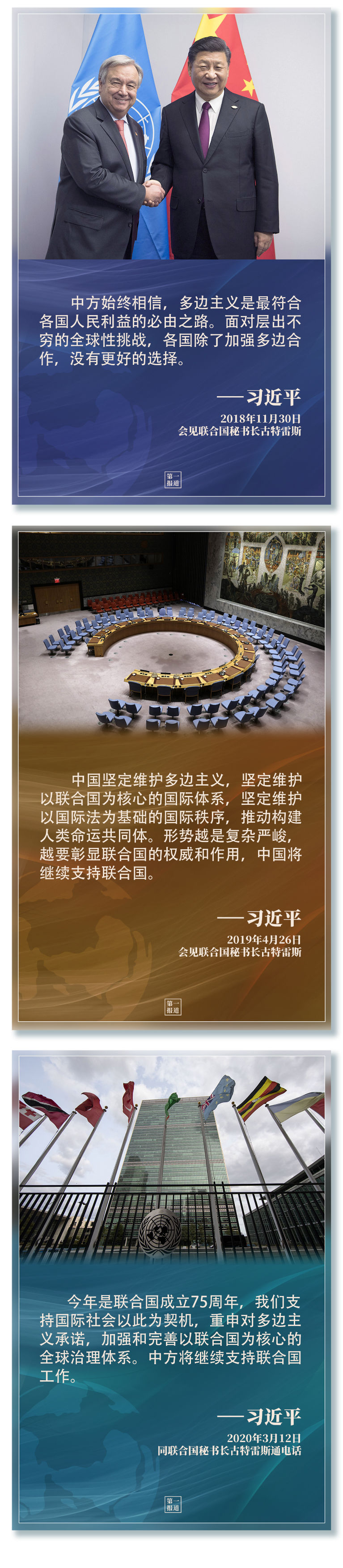 習主席指出,“支持聯合國發揮作用,維護聯合國權威和地位,是中國外交一項基本政策?!?/strong>2013年以來,習主席多次會見聯合國主要官員,訪問聯合國總部及聯合國專門機構,出席一系列聯合國活動……親自推動中國同聯合國的合作,發出支持聯合國事業、捍衛多邊主義的中國強音。