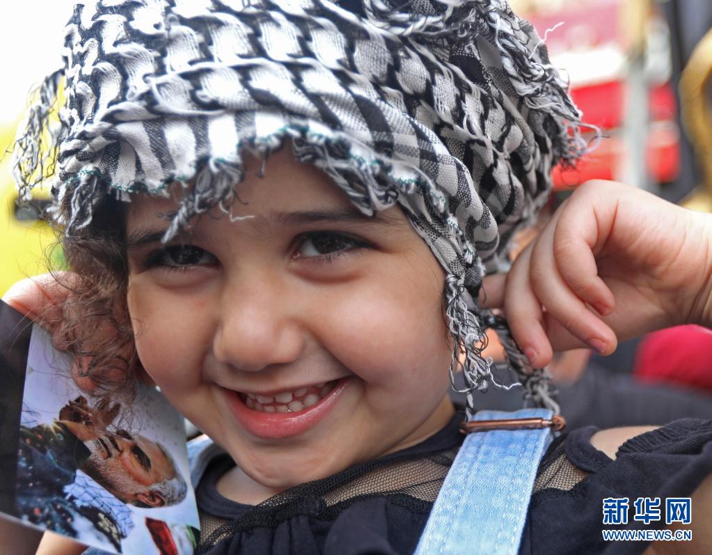 5月15日,一名兒童在黎巴嫩首都貝魯特參加抗議示威活動,聲援巴勒斯坦民眾。