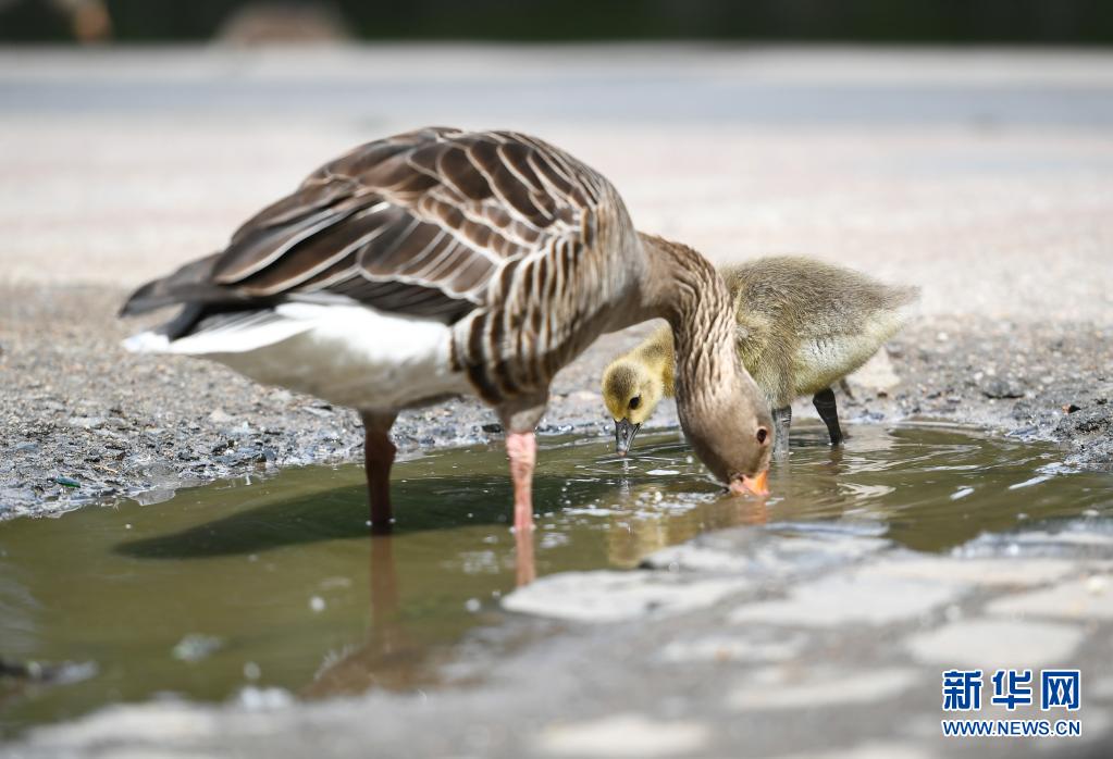 5月19日,兩只灰雁在德國法蘭克福的美茵河畔飲水。