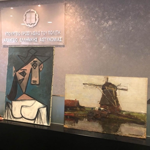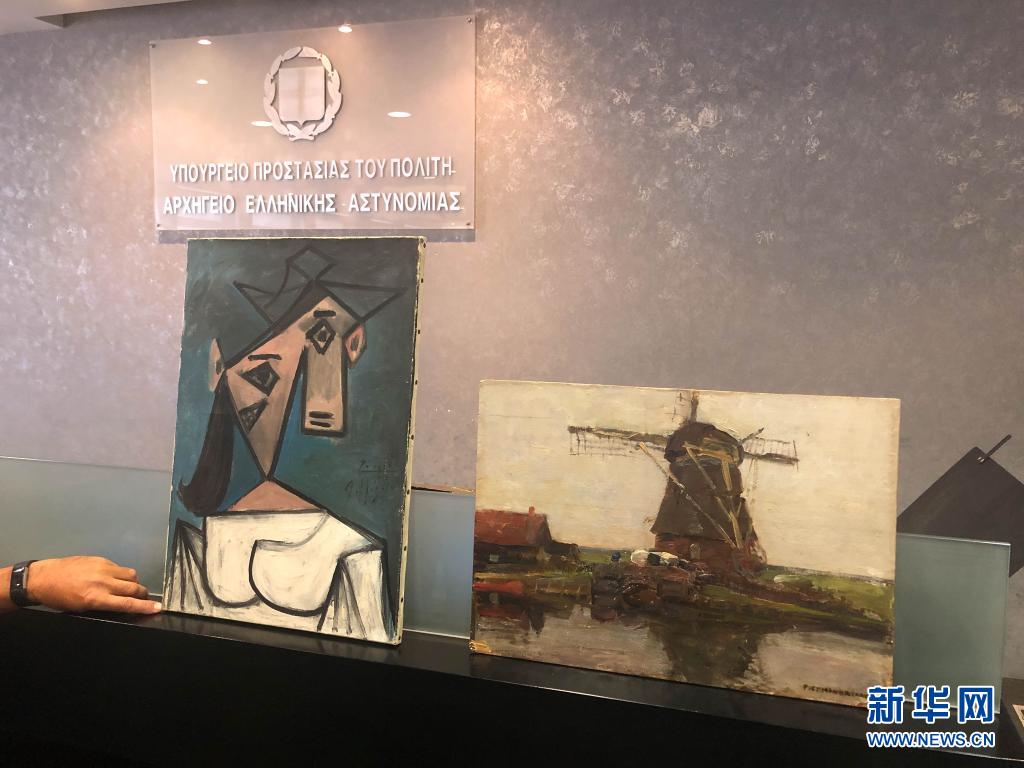 6月29日,警方在希臘雅典展示失竊的畢加索作品《女人頭像》(左)和皮特·蒙德里安創(chuàng)作的《磨坊》。